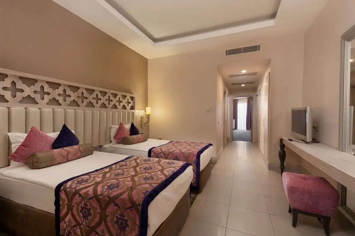 Ara Kapılı Aile Odası:2 yatak odasından oluşur. Ebeveyn yatak odası french bed, diğer yatak odası twin bed ve arada bağlıntılı kapı mevcuttur. Küvet & duş ve WC donanımıyla tek banyo mevcuttur. Minimum kapasite 2+2, maksimum kapasite 4 kişidir. Kara ve deniz manzaralıdır.