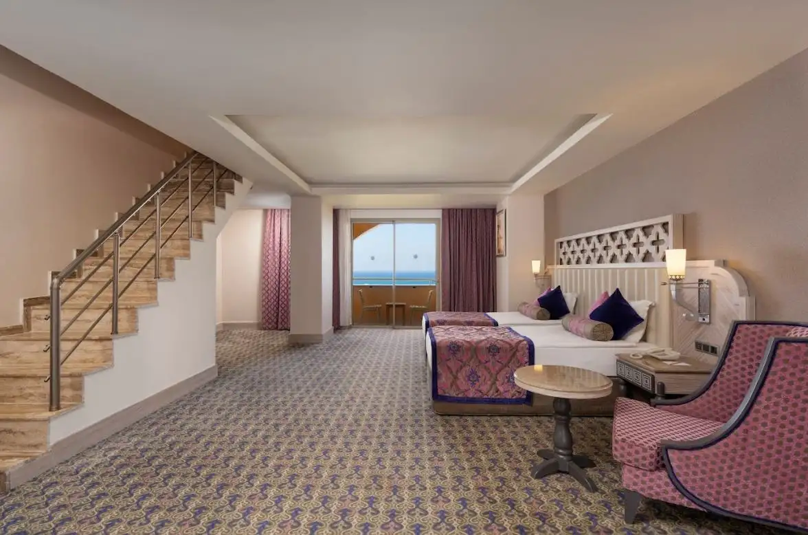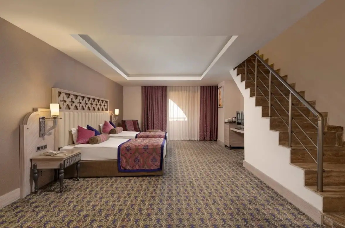 Dubleks Aile Odası:İki katlıdır.Ebeveyn yatak odası french bed, diğer yatak odası twin bed ve arada bağlantı kapısı yoktur. Ebeveyn yatak odası üst kattadır, küvet & duş ve WC donanımlıdır.Alt kat ise twin yatak ile duş ve WC den oluşmaktadır. Minimum kapasite 2+2 ve maksimum kapasite 4 kişidir. Deniz veya kara manzaralıdır.