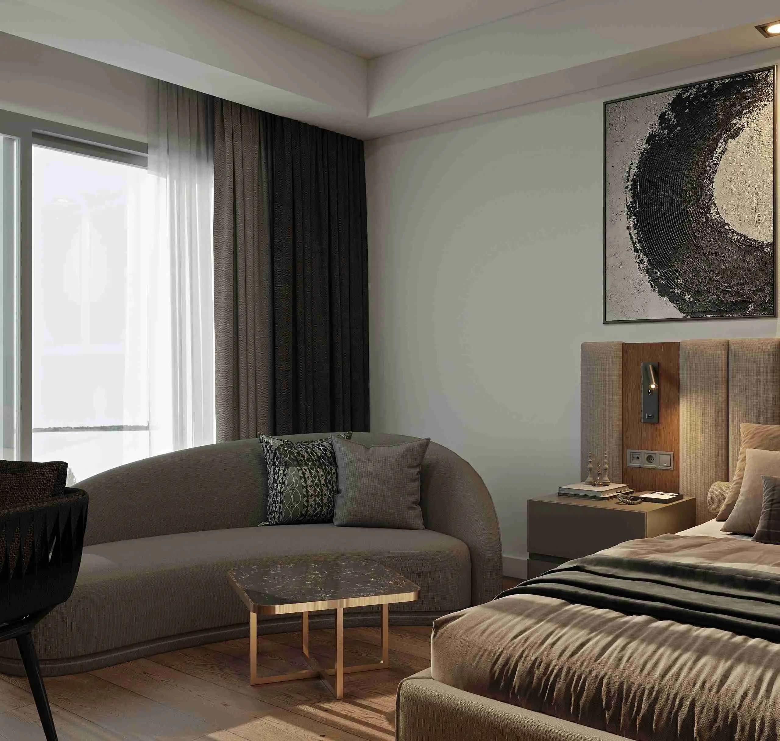 konaklama, deniz veya kara manzarası eşliğinde zarafet ile huzurun buluştuğu