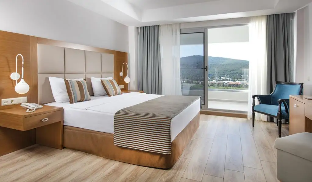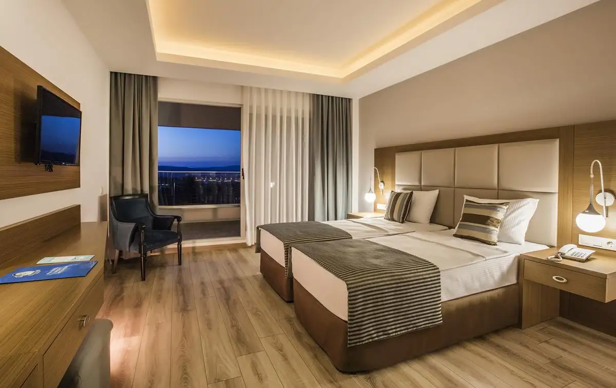 deniz manzaralı olup, 26 m² büyüklüğündedir. Odalarda çift kişilik bir yatak
