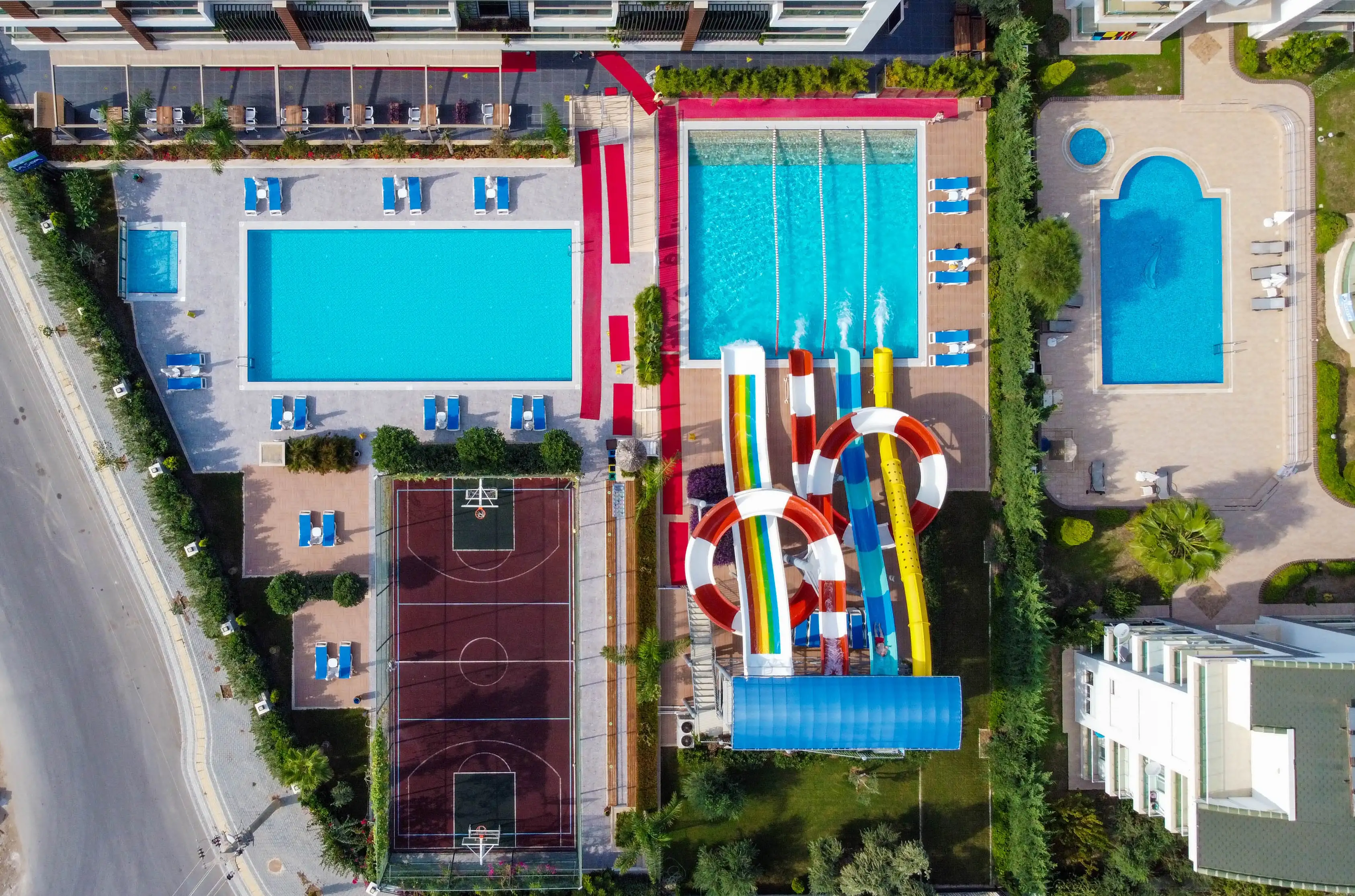 - Aquapark, snack bar, voleybol, basketbol ve mini futbol sahası ile tesis arasında yol bulunmaktadır.