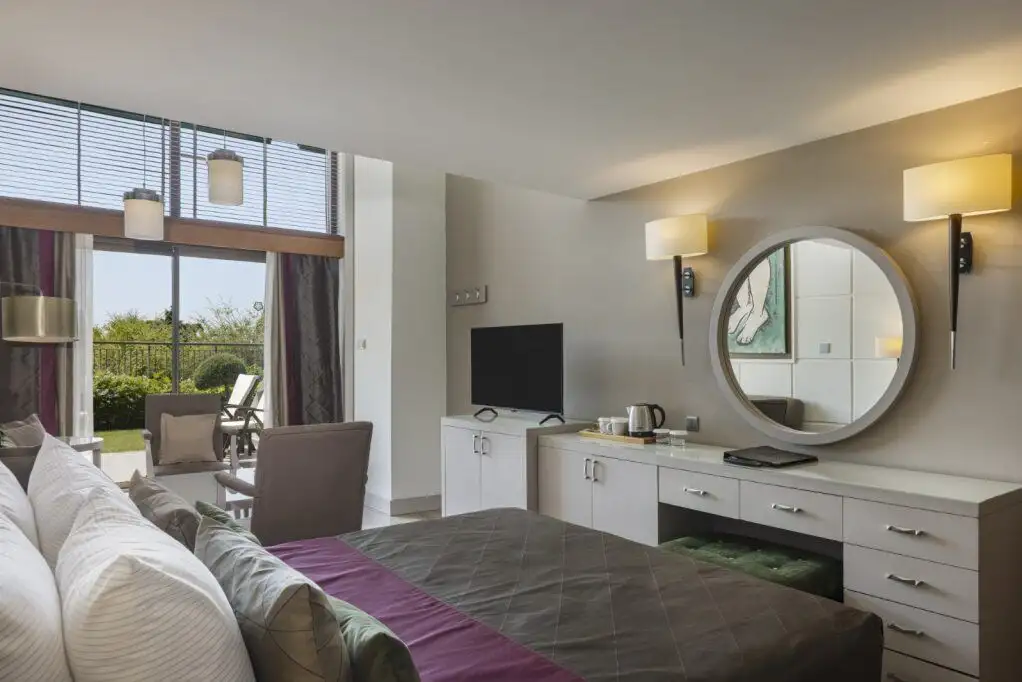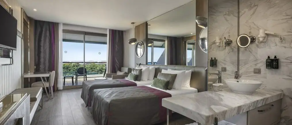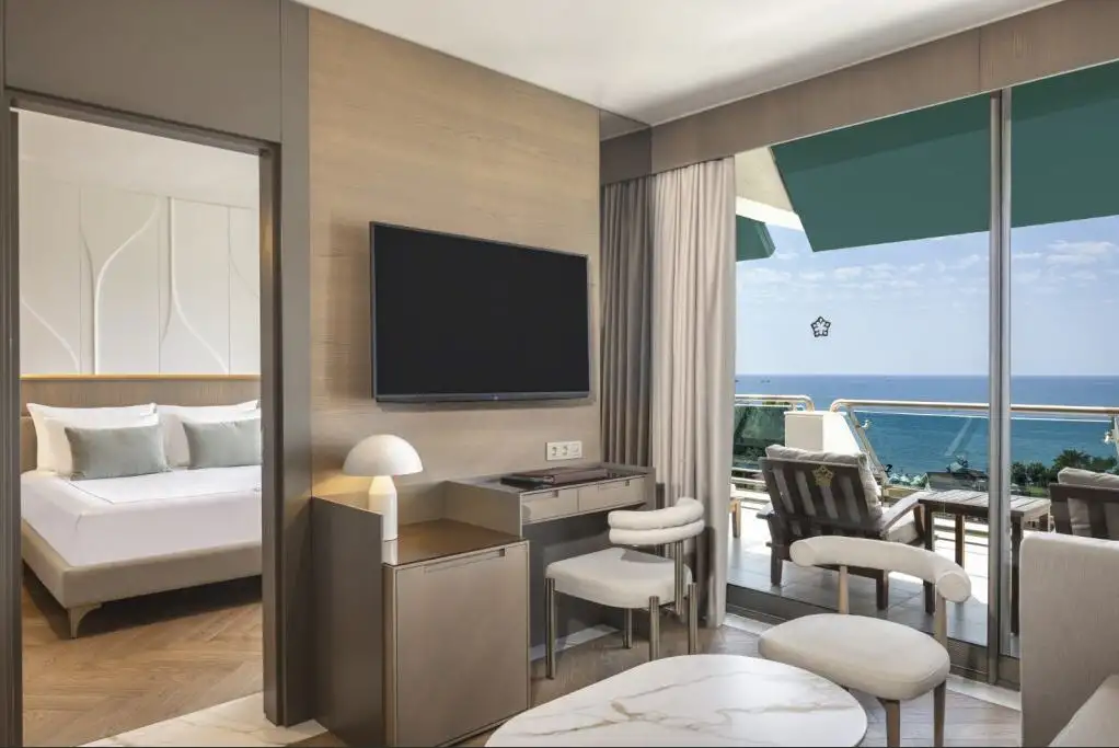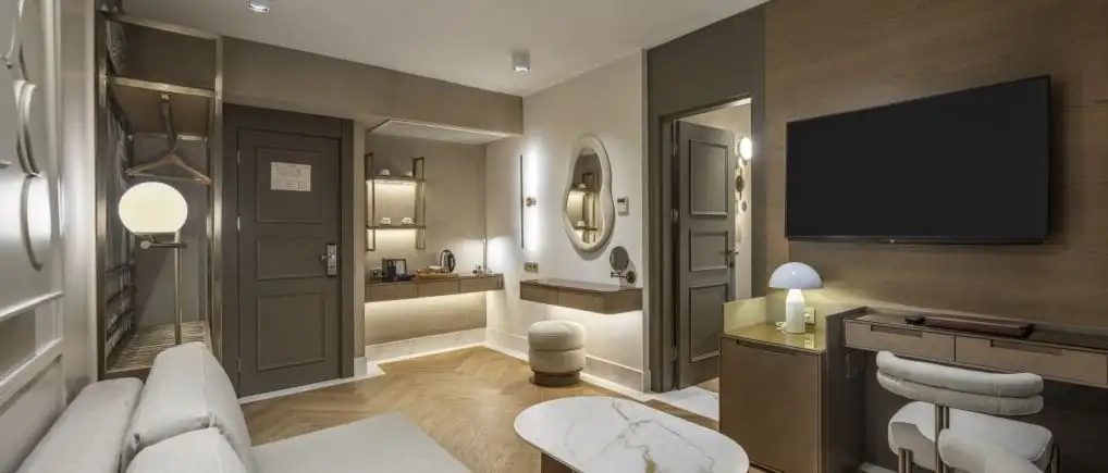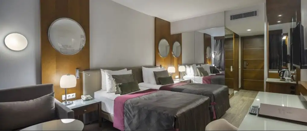 1 Oda French Bed + 1 Oda Oturma Grubu vardır. Girişte odaya şampanya, meyve